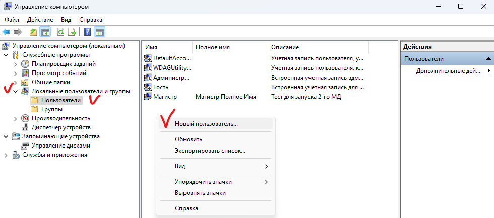 - В пункте "Локальные пользователи и группы" выберите "Пользователи", затем "Новый пользователь":