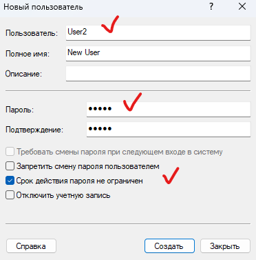 - Добавьте нового пользователя, например, User2, задайте ему пароль (нужно будет вводить каждый раз при запуске программы от его имени), а также установите галку "Срок действия пароля не ограничен":