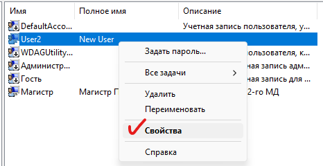 - По правой кнопке мыши выберите "Свойства" у нового пользователя: