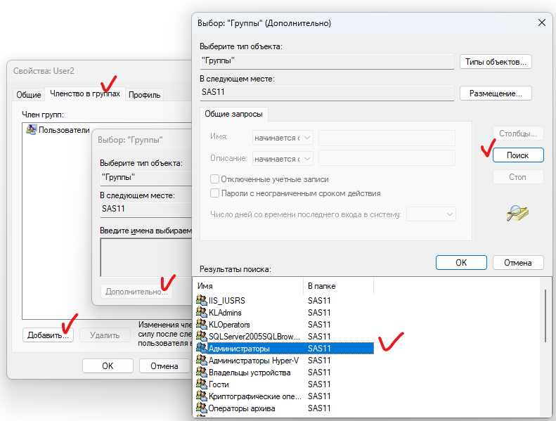 - Добавьте нового пользователя в группу Администраторы. Закладка "Членство в группах", "Добавить...", "Дополнительно", "Поиск", выберите в результатах поиска Администраторы и нажмите ОК.