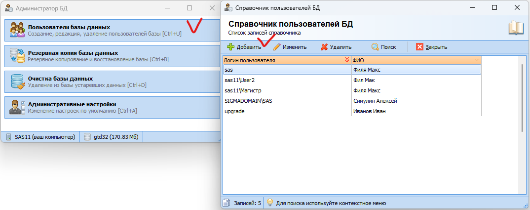 - После восстановления проверьте, что текущий пользователь нового компьютера добавлен в Пользователи базы данных. Выберите пункт Пользователи базы данных, добавьте текущего пользователя при необходиомости (Инструкция по добавлению пользователей)