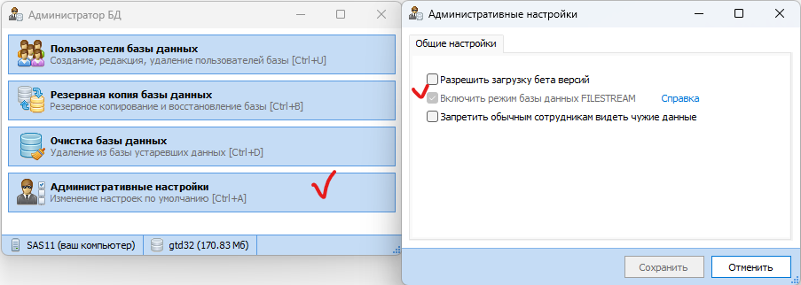 - В Административных настройках проверьте, что стоит галка на пункте Включить режим базы данных FILESTREAM. Если нет - обратитесь в отдел сопровождения Сигма-Софт для его включения