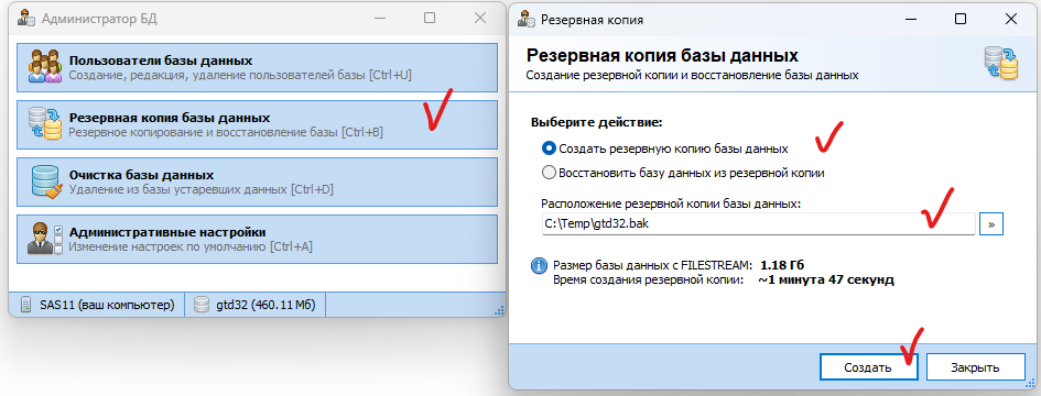 - В утилите администратора выберите Резервная копия базы данных / Создать резервную копию базы данных / Создать