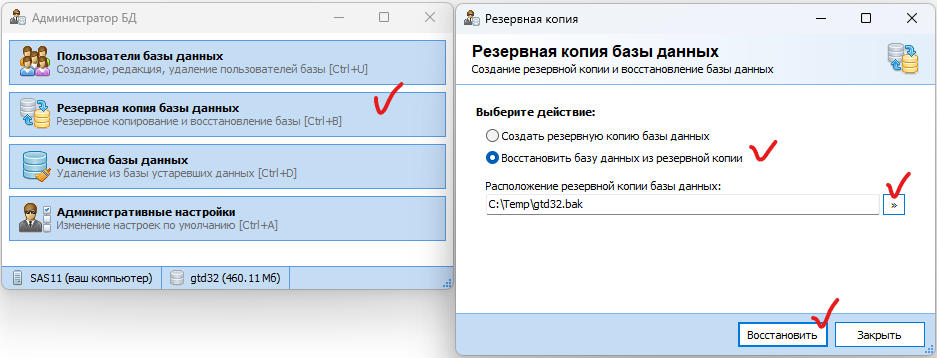 - В утилите администратора выберите Резервная копия базы данных / Восстановить базу данных из резервной копии, выберите файл резервной копии базы данных, нажмите Восстановить